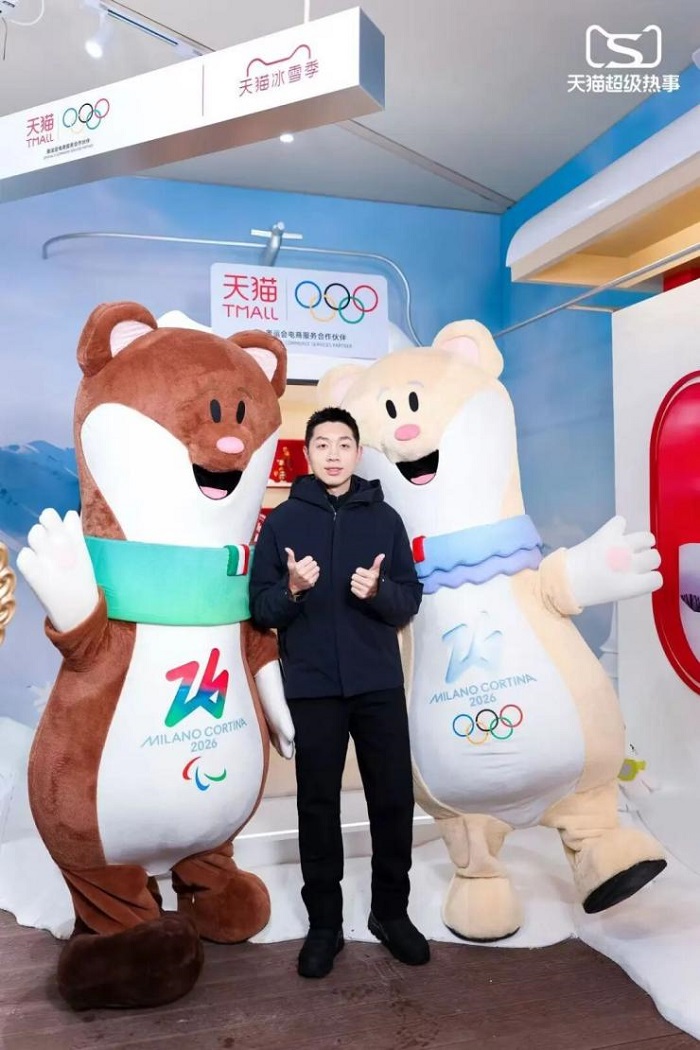 (奥运冠军许昕与米兰冬奥会吉祥物Tina&Milo合影)